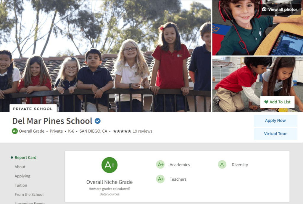 Congratulations to Del Mar Pines School. The 2024 Best Schools (Niche Grades & Rankings) gave Del Mar Pines School an A+ Grade!! Schools with an A+ grade are among the top 2.5% of schools in the country. The Niche uses sophisticated data analysis to calculate grades and ratings from dozens of public data sets and millions of reviews.